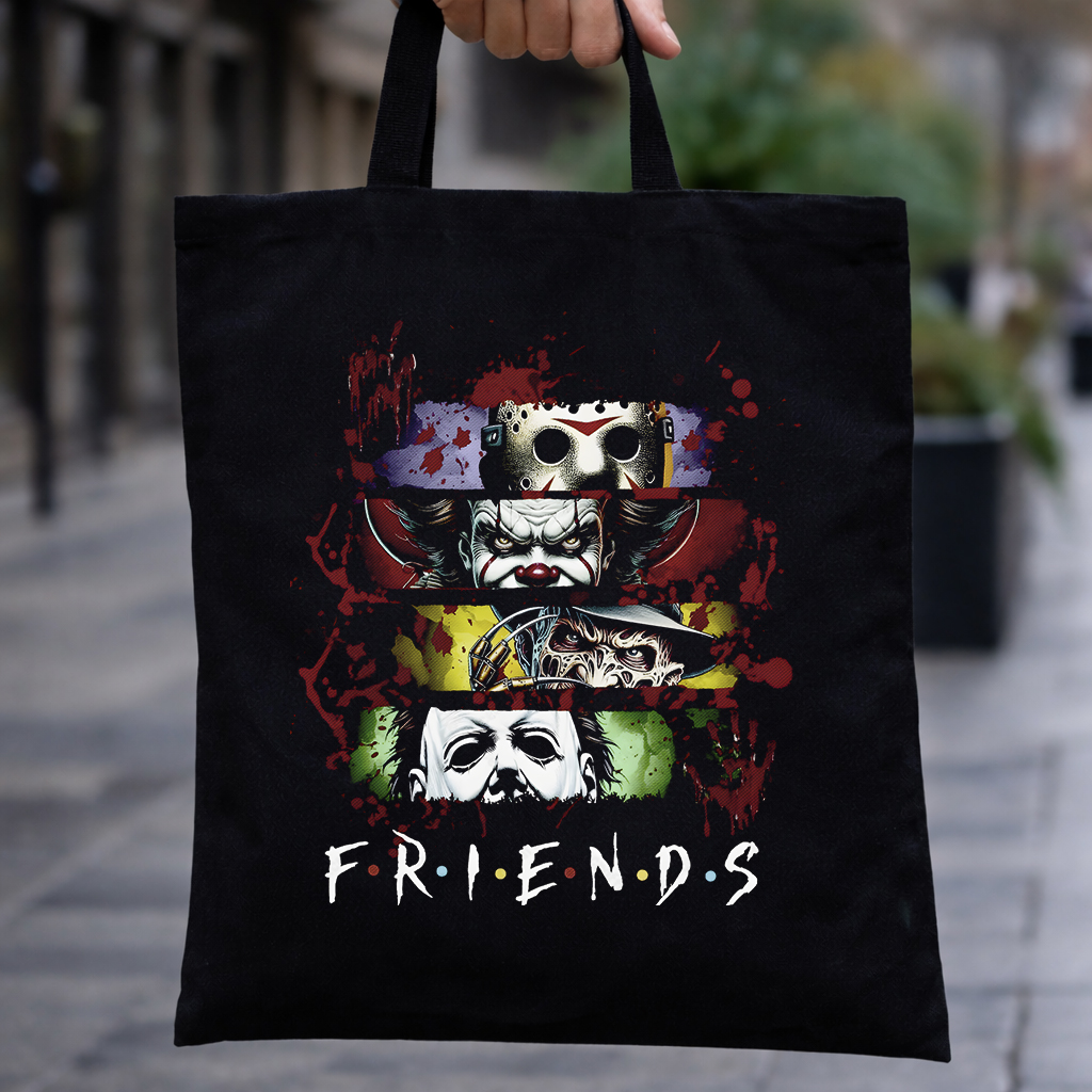 Bolsa tote negra con diseño impactante que mezcla algunos de los personajes más icónicos del cine de terror en un estilo único. Una versión oscura y creativa que juega con el contraste entre lo clásico y lo macabro.